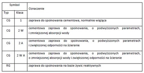W przeciwieństwie do zapraw cementowych norma nie przewiduje dla zaprawna bazie żywic reaktywnych podziału na dodatkowe klasy lub typy.