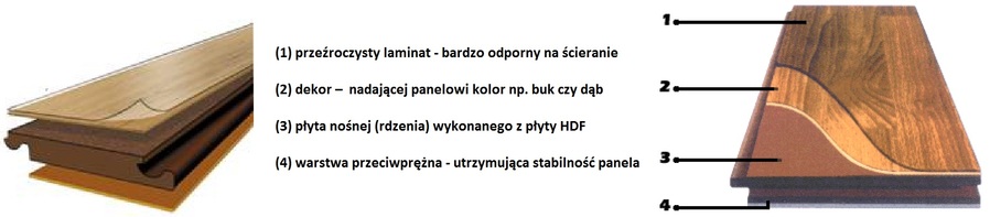 Panele podłogowe w większości składają się z drewna (ok. 75%) Trzon konstrukcji stanowi płyta HDF w 80 – 90 proc. wykonana z włókien drzewnych , Dolna część to papier przeciwprężny, gwarantujący podłodze podwyższoną stabilność oraz chroniący przed wilgocią. Zewnętrzna część powleczona jest laminatem lub papierem dekoracyjnym najczęściej imitującym drewno. Na to nałożona jest warstwa żywicy.